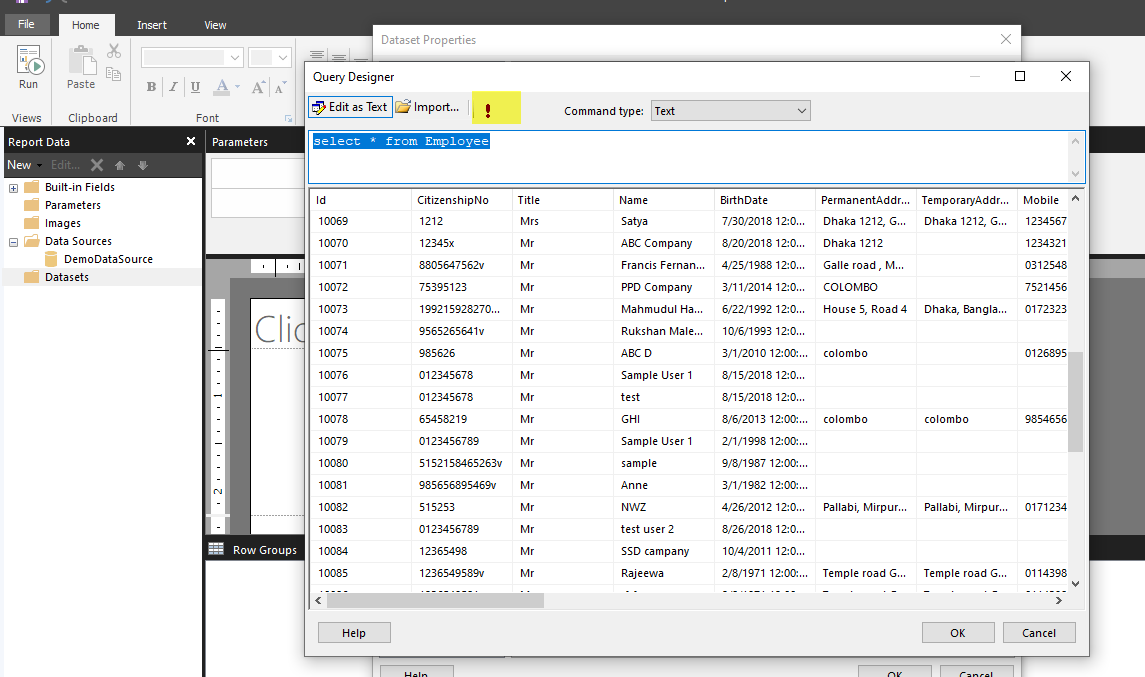 8. Insert Dataset Name, select Data source, write query to get data from your database. For demo purpose, I am going to use Employee Table from my database.