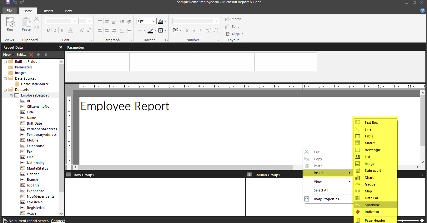 MS Report Builder: If you go to Insert option then, you can see a lot of options to design reports. MS Report builder provides varieties of drag and drop options to design interactive graphical reports with less effort.