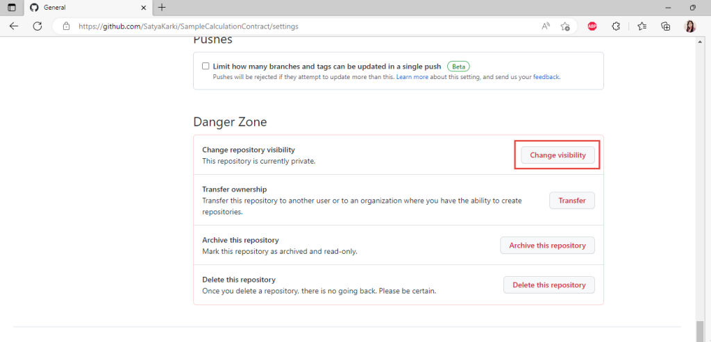 Step 2- Go to the Change visibility section which is at the bottom of the setting and inside the Danger zone as illustrated below.