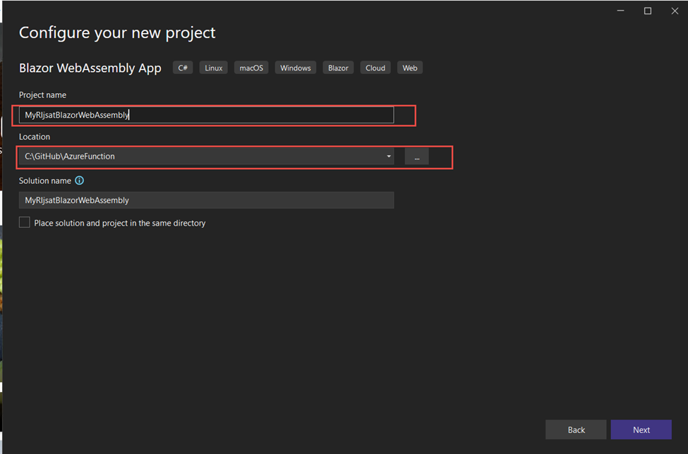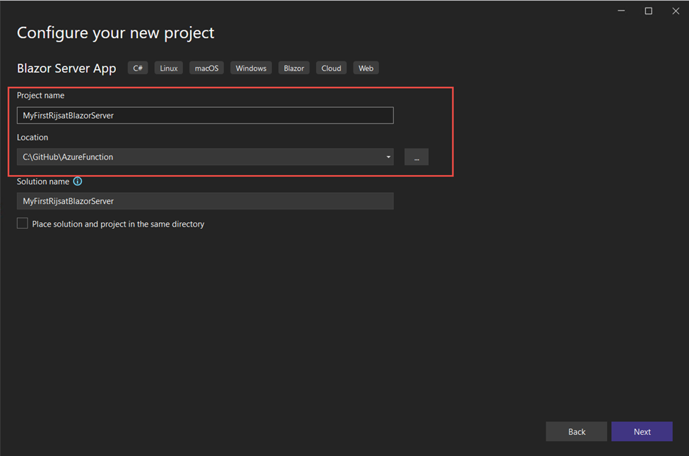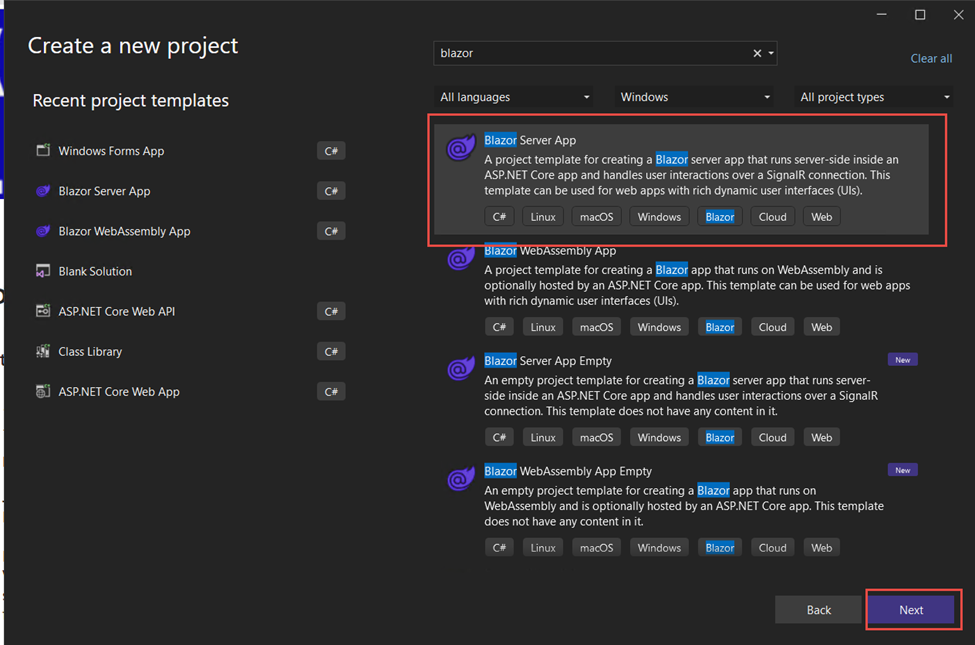 To develop Blazor server application, we will choose Blazor server app template and proceed to next. We will give a project name and location.