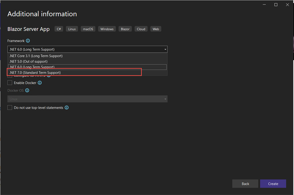 After installation of .NET 7 SDK, we will have an option to choose .NET 7 in the framework. We will select .NET 7 framework and proceed. To keep it simple, we will keep other options default.