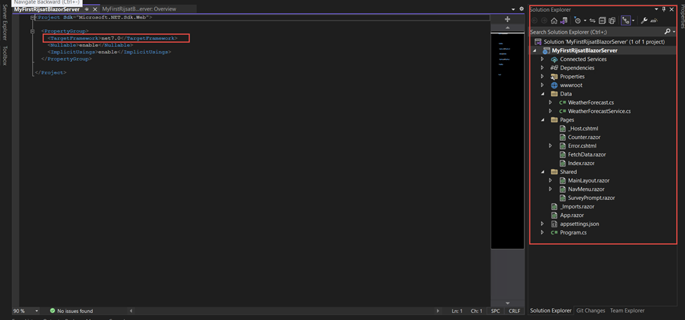 We have successfully created a Blazor server web application, and the project structure as shown.