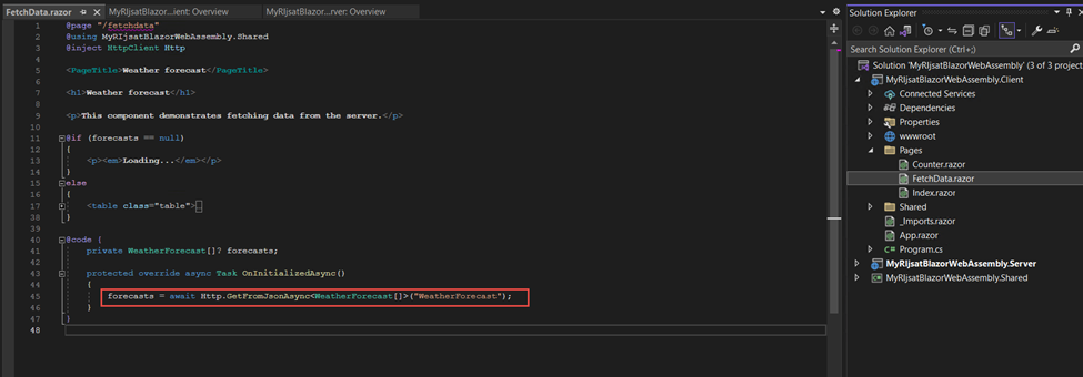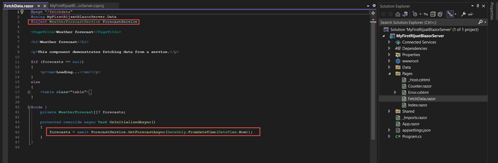 Furthermore, if we check FetchData.rozor page/component, we can call the services, business logic classes directly from Blazor page and use application models.