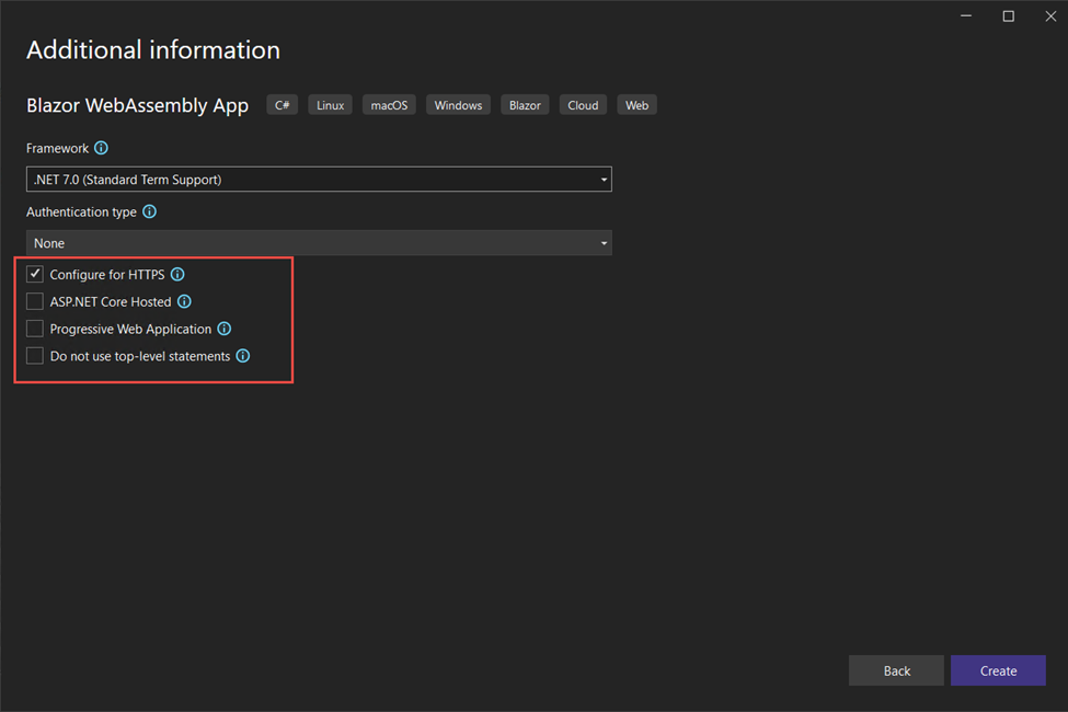 In the next screen, we will choose .NET framework 7, authentication type as none for this article, and there are some more options as illustrated.