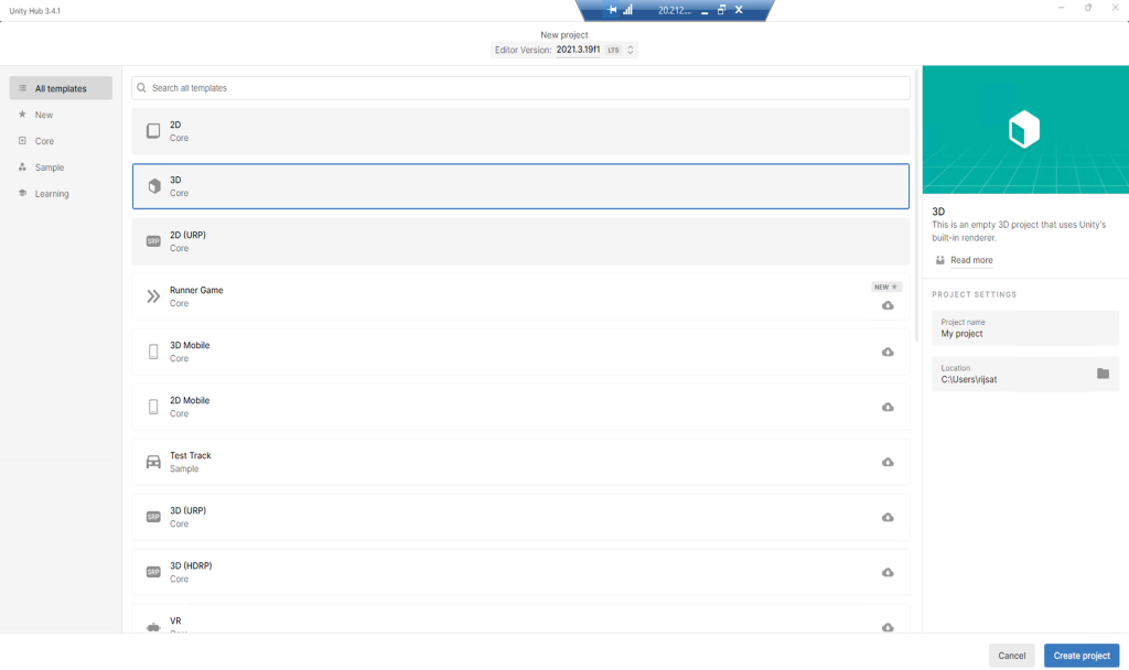 Once installed you can open the unity and create different projects using the templates as depicted below. You can create 2D, 3D, Runner games, 3D mobile, 2D mobile, VR, AR, and so on.