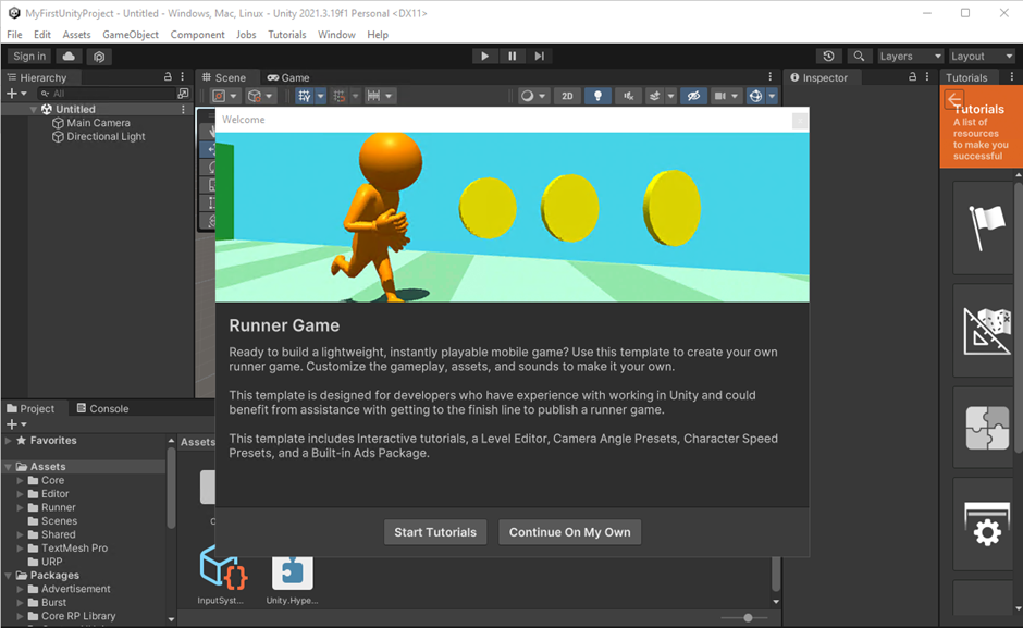 Once the Runner game is created you will see the screen whether to Start Tutorials and continue My Own. If you are new to the Runner Game, you may choose the Start Tutorials option or if you know Runner Game then you can Continue on Your Own.