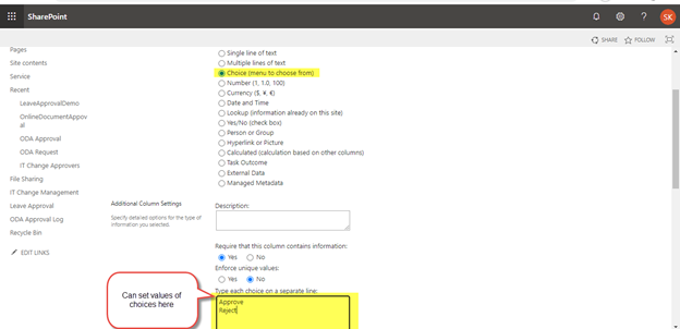 In this example, I have added Approve and Reject as choice options.