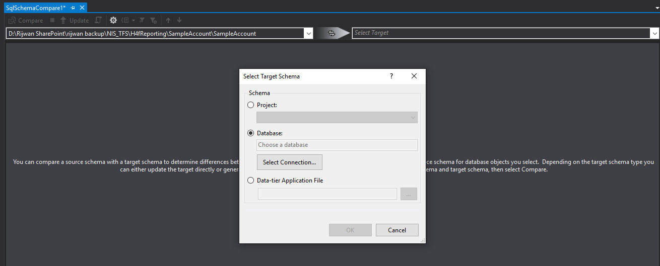 We can prove a connection to the local database, Network database, or Azure database either in source or destination. In other words, we can compare the two databases of different sources i.e. Development to Production, Development to UAT, development to Production, or any two SQL server databases. Another important point we can compare any destination database with the project included database as well.