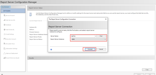 When the Report Server Configuration Manager opens, following screen with Server Name and Server Instances including your setup environment details will be appeared then click on connect.