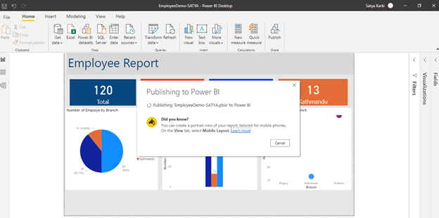 Now to Publish your reports to Power BI Service online click on Publish option as depicted below.