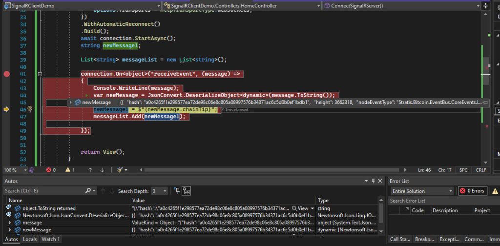 To make a connection, we need to create HubConnectionBuilder and start the Build, where we have to provide the server URL and message event. The below example withUrl contains the signalR server URL and signalR event hub name. You need to provide the correct value in the WithUrl in order to connect with the server.