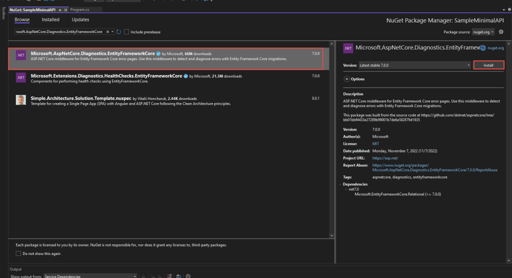 Minimal APIs are designed to create HTTP APIs with minimal dependencies. Minimal APIs are suitable for microservices and applications that include minimum files, features, and dependencies with ASP.NET Core. Minimal APIs were there since .NET 6 and it helps you to easily create API. At the time of this article write up .NET 7 is recently released. It has included several improvements in performance, new features for C#11 &F#, .Net MAUI, ASP.NET Core/Blazor improvement, Web APIs, and many more. Additionally, you can easily containerize your .NET 7 projects as well as configure CI/CD workflows for GitHub actions. Moreover, .NET MAUI is a part of the .NET 7. .NET 7 is officially supported by Microsoft for only 18 months, and it is labeled as Standard term support. This article demonstrates how to create Minimal APIs using .NET 7 and Entity Framework Core 7.