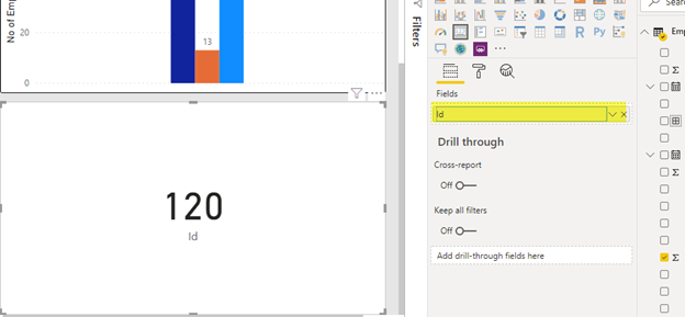 Then drag the column which you want to show in the card. My case I want to show total number of employees in an organization, so I am going to drag Id to Field.